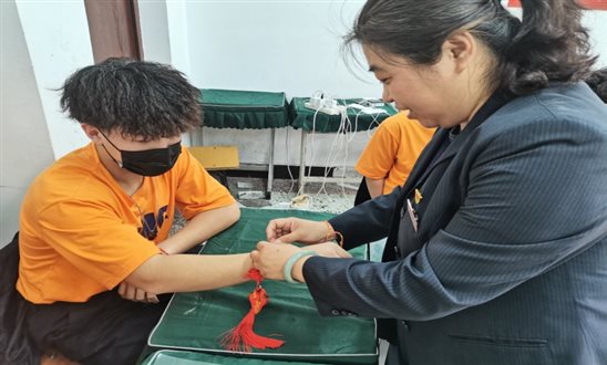 6月10日下午,支部书记张莉同志走进了2020级制药班的教室。同学们以一支热闹非凡的“欢迎舞”迎接老师们的到来。班长刘鑫宇向同学们讲述了端午节的由来和相关习俗,张莉书记为同学们系上象征健康、平安的五彩绳,并送出端午祝福。正值期末考试来临之际,她又叮嘱同学们在节日快乐的气氛之余一定要好好复习,站好最后一班岗,争取在期末考试中打一场胜仗。李想同学激动地说:“参加这个活动特别高兴,班级早早就备好了包粽子的材料,每天有人给米换水,及时给粽叶泡水。”陈美彤同学表示,自己在家从来没干过这些活儿,今天一定要和人生中亲手包的第一个粽子合个影。