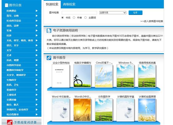 图书资料与网络管理中心,为了让全校师生随时随地能够体会到读书的乐趣,在学院网站上开通了电子图书馆。电子图书数据库共有电子图书10万余册电子图书,涵盖了经典理论、哲学、社会科学、政治、军事、文学、艺术、历史、地理等22个大类。可以通过分类目录导航或检索功能找到自己需要的图书。不仅方便了教师教学研究学习,也方便了学生更加便捷快速的找到自己想看的图书。自学院网站的电子图书馆成立以来,点击阅览量每天居高不下,从纸质书籍到电子书籍,从图书馆到电子阅览室,图书资料与网络管理中心一直致力于为全校师生服务,推进了学院文化建设、信息化建设的进程。
