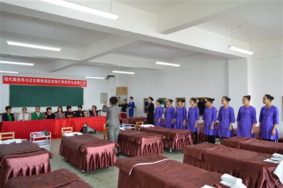 现代服务系举行的企业技师进课堂培训在历时一个月后即将告一段落,为检验教学成果,5月16日下午,在四号实训楼美容实训室举行了“现代服务系与北京薇格瑞丝美容机构首届订单班教学成果展示”活动。由于专业的特殊性,院党委副书记杨薇带领各处室女处长们观摩了此次成果汇报表演,并对此次校企合作企业技师进课堂授课给予高度肯定。