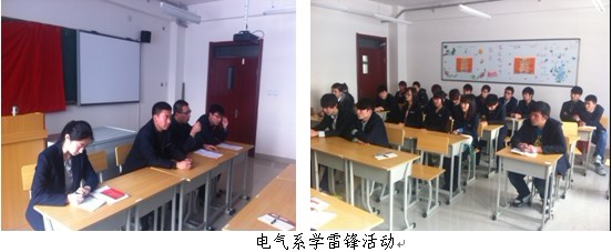 电气工程系团总支倡议各班召开主题团会、制做主题墙报。系领导高度重视,亲自参加了在学院九楼大会议室召开了“弘扬雷锋精神,共创和谐校园”的公开团会,为学雷锋活动掀起了高潮。