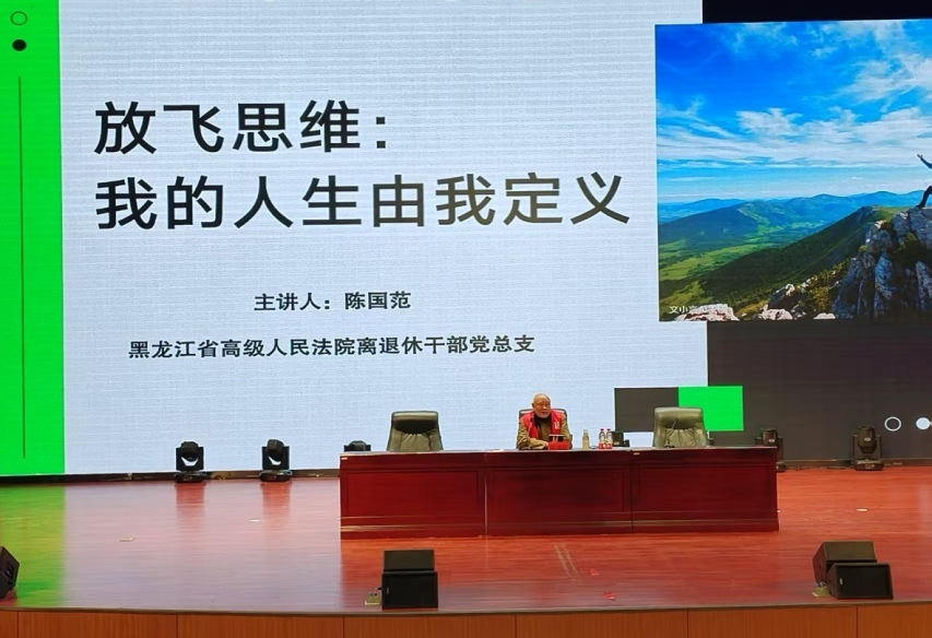本次讲座特邀黑龙江省高级人民法院原刑事审判资深法官陈国范老师授课,以“放飞思维 我的人生由我定义”为主题,与学生一起探讨如何打破思维定式、树立成长自信、规划属于自我的人生路径。