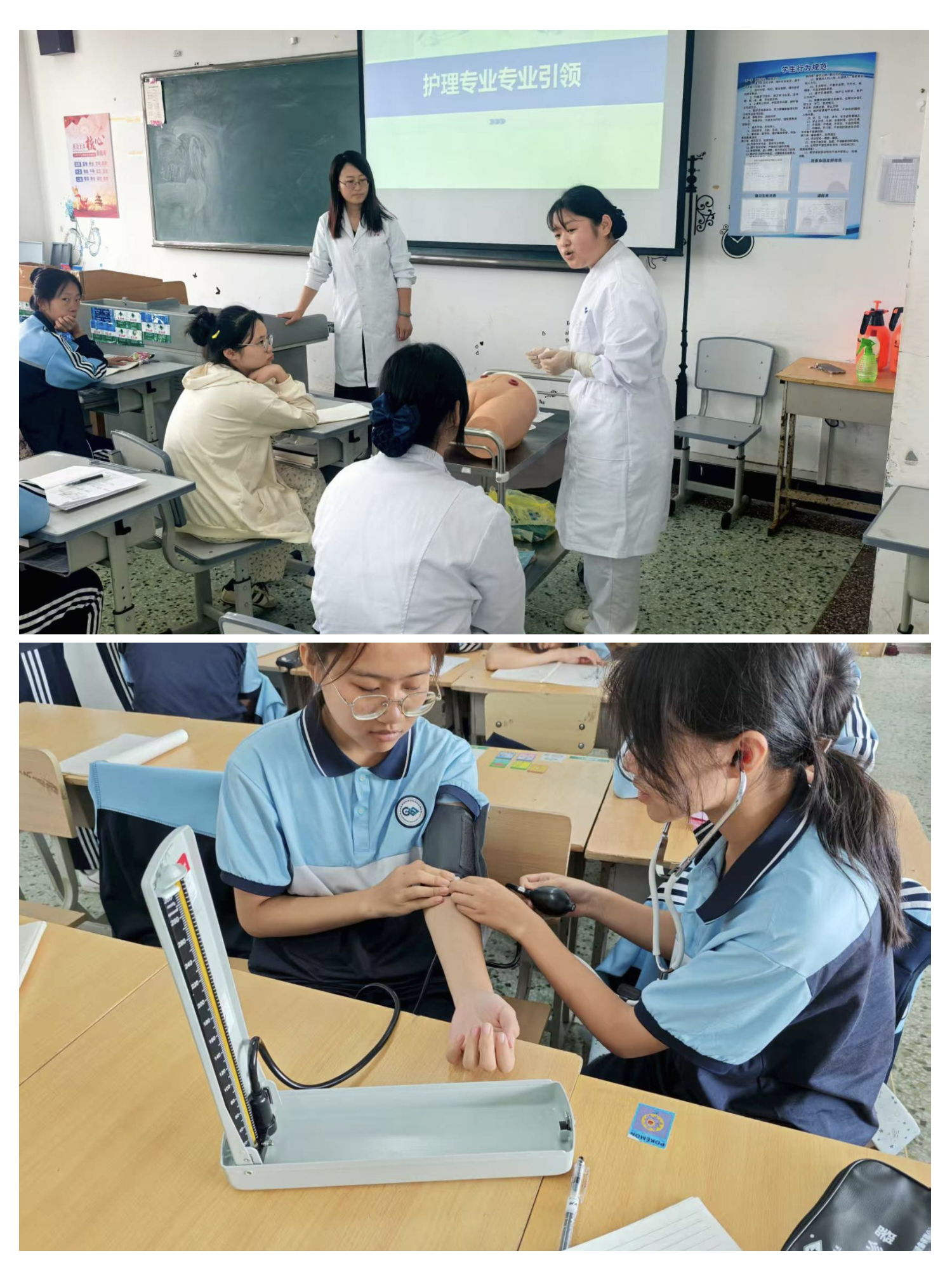 护理专业安排参赛学生给新生进行包扎技术演示、血压计测量等活动