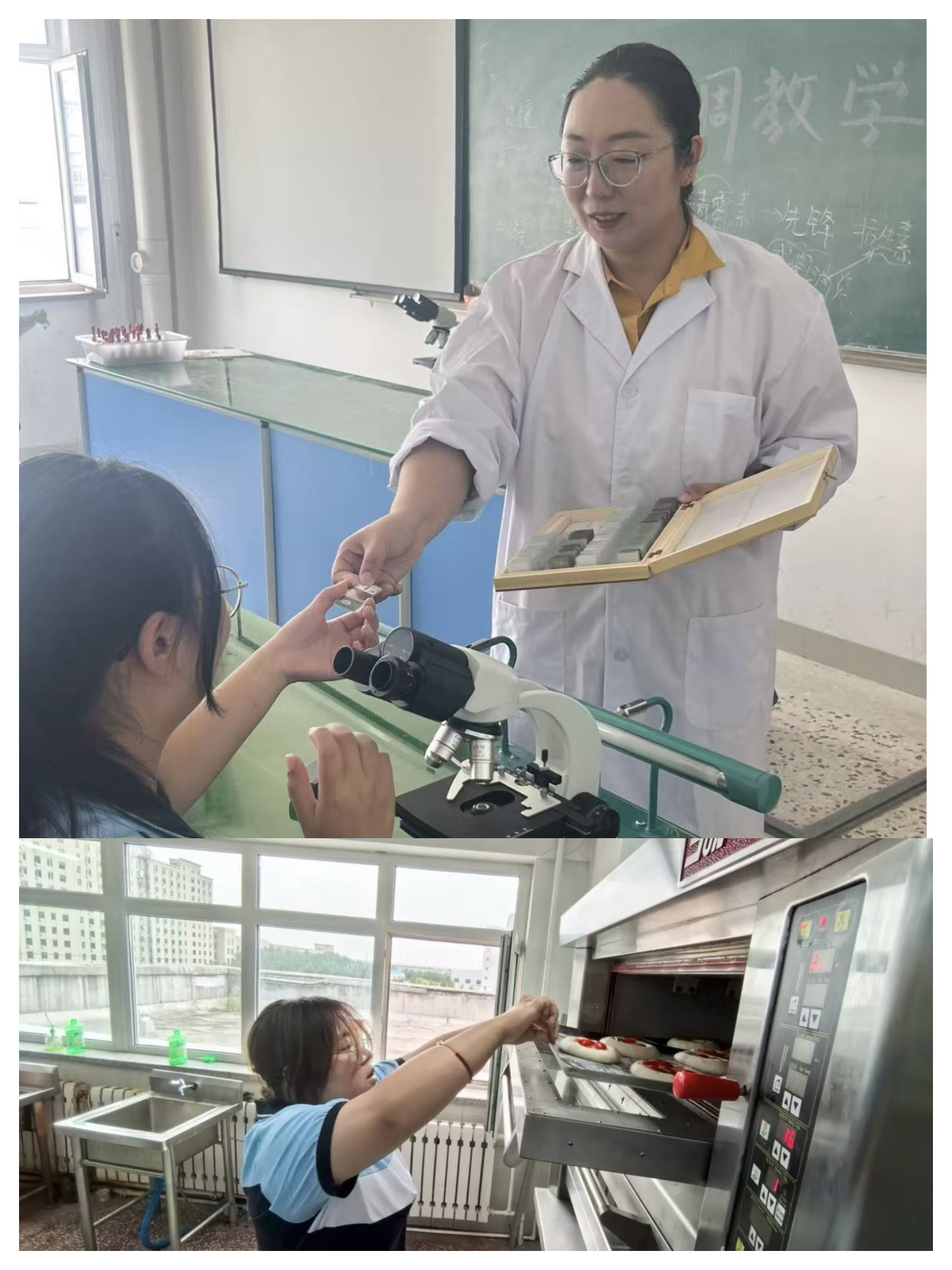 食品专业学生在进行微生物观察、面包制作等兴趣教学