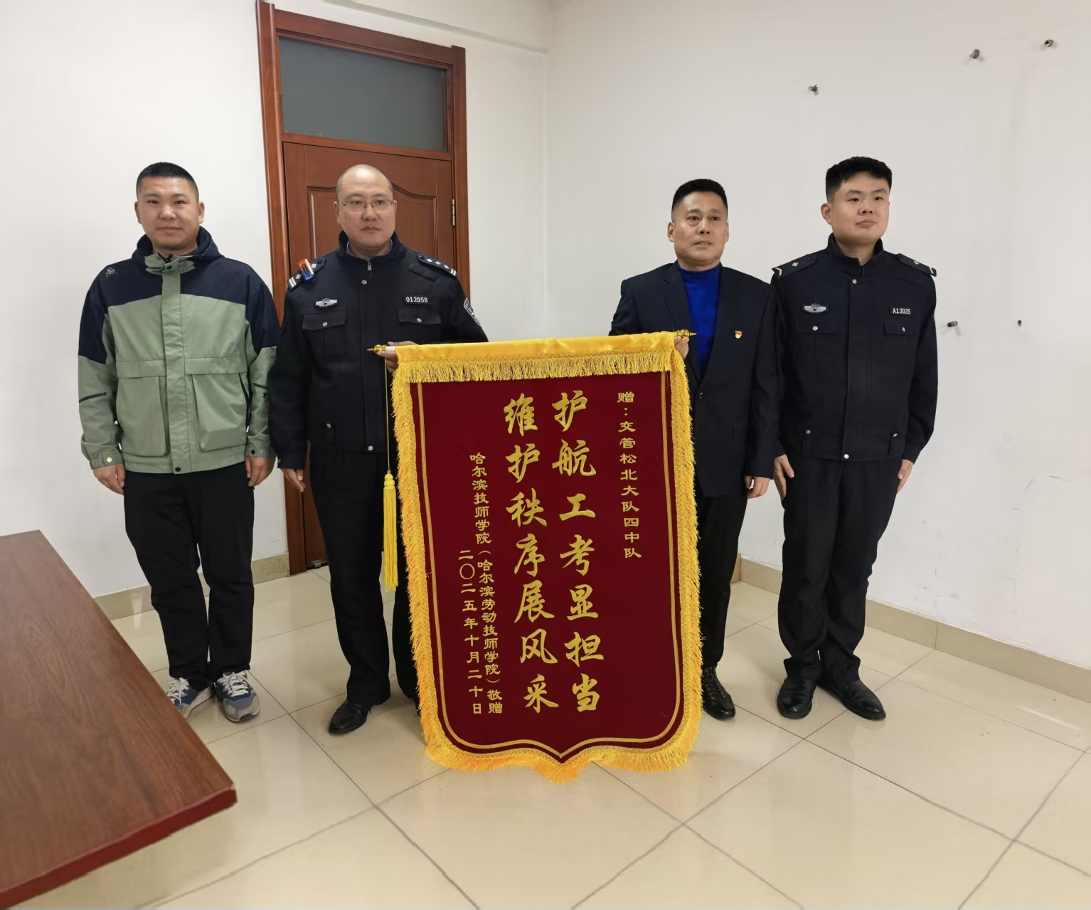 10月29日上午,哈尔滨技师学院(哈尔滨劳动技师学院)保卫处处长肖子奇等三人前往松北区交警大队四中队,向执勤交警赠送一面印有“护航工考显担当 维护秩序展风采”字样的锦旗,以此表达对该中队长期以来为维护校园周边交通秩序、保障师生出行安全所做贡献的感谢。