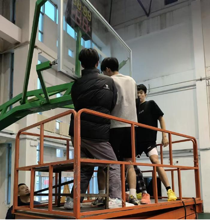 活动当天,党员干部与学生志愿者早早携带维修工具来到体育馆。经前期排查,馆内部分篮球架存在篮板松动、支架锈蚀、篮网破损等问题。“大家分工协作,注意规范操作!” 系教育主管田甲第指导学生迅速划分工作小组。