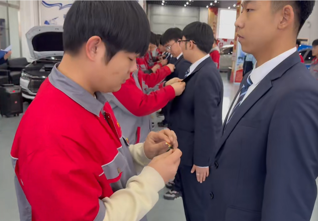 12月11日中午,庄严的国歌声在四号实训楼内响起,汽车工程系2025年秋季学期新团员入团仪式在此隆重举行,胡鑫阳等10名优秀青年在师长的见证下庄严戴上团徽。院团委负责人、学生工作部部长李洪军与汽车工程系党支部书记李永久参加了入团仪式,仪式由汽车工程系团总支书记于江红老师主持,全体在校团员现场参加,不在校团员以腾讯会议形式线上参加。
